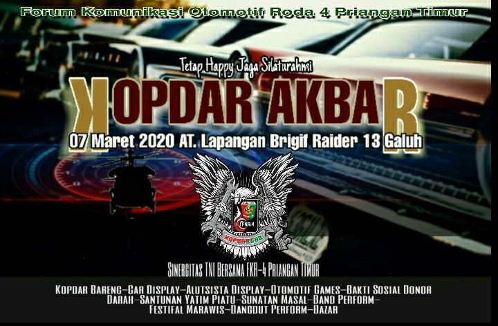 Dalam gelaran kali ini akan melibatkan berbagai klub mobil se-Priangan Timur. “Ini bentuk dari sinergitas antara FKR-4 Priangan Timur dengan TNI dalam hal ini Brigif Raider 13/Galuh, dengan mengadakan Kopdar Akbar yang akan di isi berbagai acara,” jelas Irfan Miftahul Palah, perwakilan panitia sekaligus salah satu admin FKR-4.