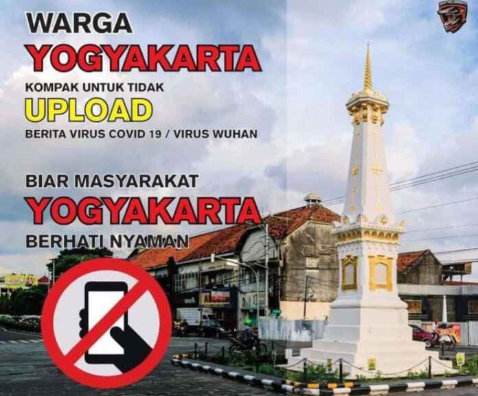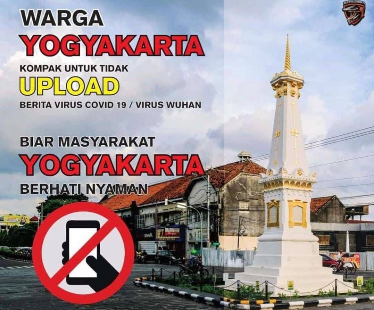 Foto berlatar kawasan Yogyakarta dengan beberapa tulisan dan gambar tambahan. “ Warga Yogyakarta KOMPAK UNTUK TIDAK UPLOAD BERITA VIRUS COVID 19/VIRUS WUHAN. BIAR MASYARAKAT YOGYAKARTA BERHATI NYAMAN,” tulisan pada uploadan pebalap ramah itu.