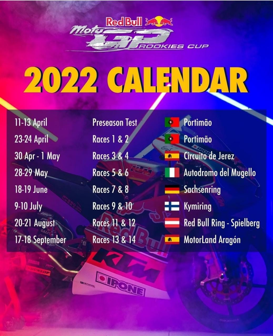 Lalu kurang lebih setiap bulannya peserta akan lakukan balapan di beberapa Negara. Dan diakhiri pada bulan September. Yang mana Sirkuit Motorland Aragon menjadi tuan rumah diputaran akhir. Lalu seperti apa jadwal Redbull Rookies Cup? Berikut jadwalnya: