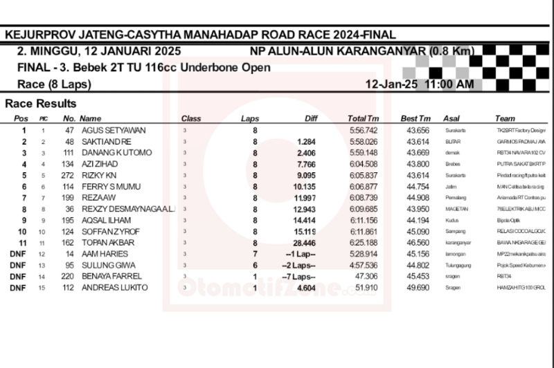 OtomotifZone.com – Karanganyar. Kelas bergengsi 2-Stroke Tune Up satu ini juga patut di perhatikan. Final Casytha Manahadap Road Race sirkuit Alun-alun kota Karanganyar, Jawa Tengah 12 Januari 2023 Bebek 2t Underbone 116cc pada sesi kualifikasi motor list hijau TK2BRT garapan Mr. David from Klaten ini ada grid terdepan.