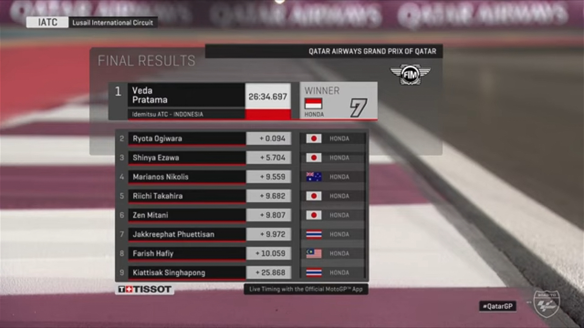 Meskipun gelar juara umum telah menjadi miliknya, Veda tak pernah mengendurkan semangatnya. Race 1 di Losail menjadi panggung pertarungan sengit sepanjang lap antara Veda, Ryota Agawara, dan Amon Odaki. Drama mencapai puncaknya di tikungan terakhir yang menegangkan.
