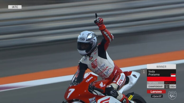 OtomotifZone.com-Qatar. Sirkuit Losail menjadi saksi dari performa gemilang Veda Ega Pratama, pembalap asal Gunung Kidul, Jogjakarta yang kembali memenangkan balap di Race 1 Asia Talent Cup 18 November 2023. Meskipun telah dipastikan sebagai juara umum dan point tak terkejar, Veda tetap tampil all out, memberikan penampilan yang memukau para penonton.