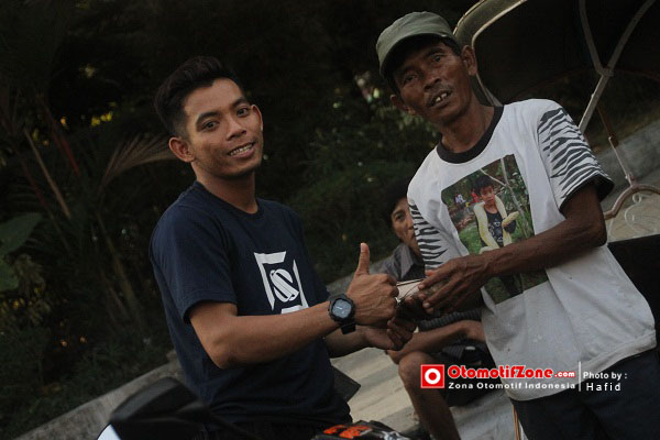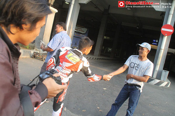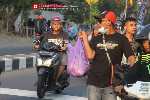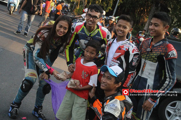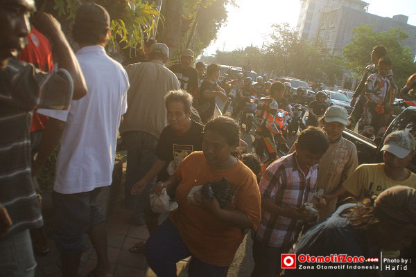 Lanjut ke acara yang di susun yaitu bagi-bagi ta’jil, start dari manahan pukul 17.00 WIB dilanjut menyusuri sepanjang jl. Slamet Riyadi bagi-bagi ta’jil disana dengan pedagang asongan, tukang parkir dan tukang becak. Tepat di depan stadion Sriwedari mereka ramai-ramai memberikan satu persatu makanan yang sudah di bungkus rapi. Ada yang lucu, para pembalap membagikannya dengan wearpack kesayangan mereka saat balap. Mantappp ..