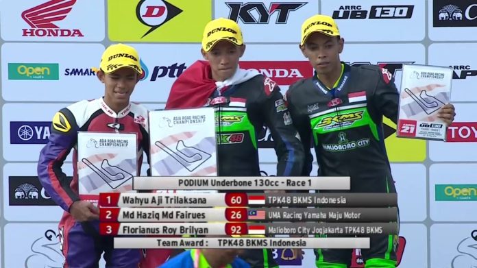 OtomotifZone.com – Buriram. Pembalap muda Indonesia, Wahyu Aji Trilaksana sukses meraih kemenangan di race 1 Underbone 130cc pada ajang Asia Road Racing Championship 2016 Seri ke-2 di Chang International Circuit – Thailand, Sabtu (7/5). “Berbekal pengalaman tahun lalu. Saya belajar untuk lebih baik tahun ini di ARRC. Tahun lalu saya juara 2 di race 2 di Buriram,” kata Wahyu Aji yang bergabung di tim TPK48 BKMS Indonesia.