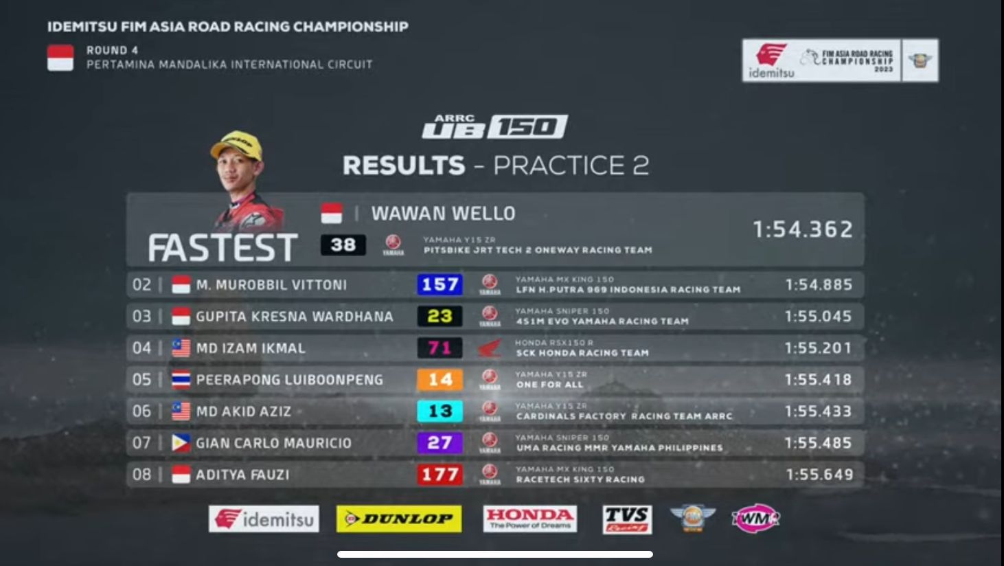 Wahyu Aji, yang memperkuat tim Racetech Sixty Racing menunjukkan performa gemilangnya di sesi Free Practice pertama. Sementara itu, Wawan Wello, yang juga berlaga untuk tim Pitsbike JRT tampil mengesankan dalam sesi Free Practice kedua. Dengan keahlian mengendara yang tak kalah memukau, Wawan mampu menunjukkan performa terbaiknya di sesi latihan bebas 2. Catatan waktu putarannya yang sangat kompetitif menempatkannya di posisi puncak, memberinya keunggulan sebagai pembalap terdepan pada sesi tersebut.