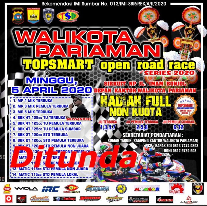 OtomotifZone.com – Sumatera Barat. Ajang balap motor bertajuk Walikota Pariaman Top Smart Open Road Race Series 2020 yang dijadwalkan akan di gelar di sirkuit NP Jl. Imam Bojol, Depan Kantor Walikota Pariaman, (5/4) mendatang secara resmi juga turut di tunda gelarannya sementara waktu.