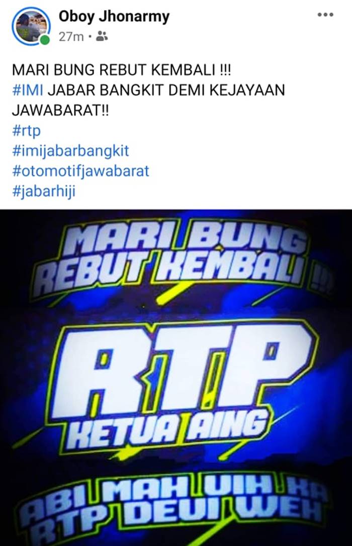 “ MARI BUNG REBUT KEMBALi!!! #IMI Jabar Bangkit Demi Kejayaan JAWABARAT!!!,” ujar Oboy Jhonarmy dalam statusnya dan memasang baju bertulisan MARI BUNG REBUT KEMBALI!!! RTP KETUA AING ABI MAH UIH KA RTP DEUI WEH .