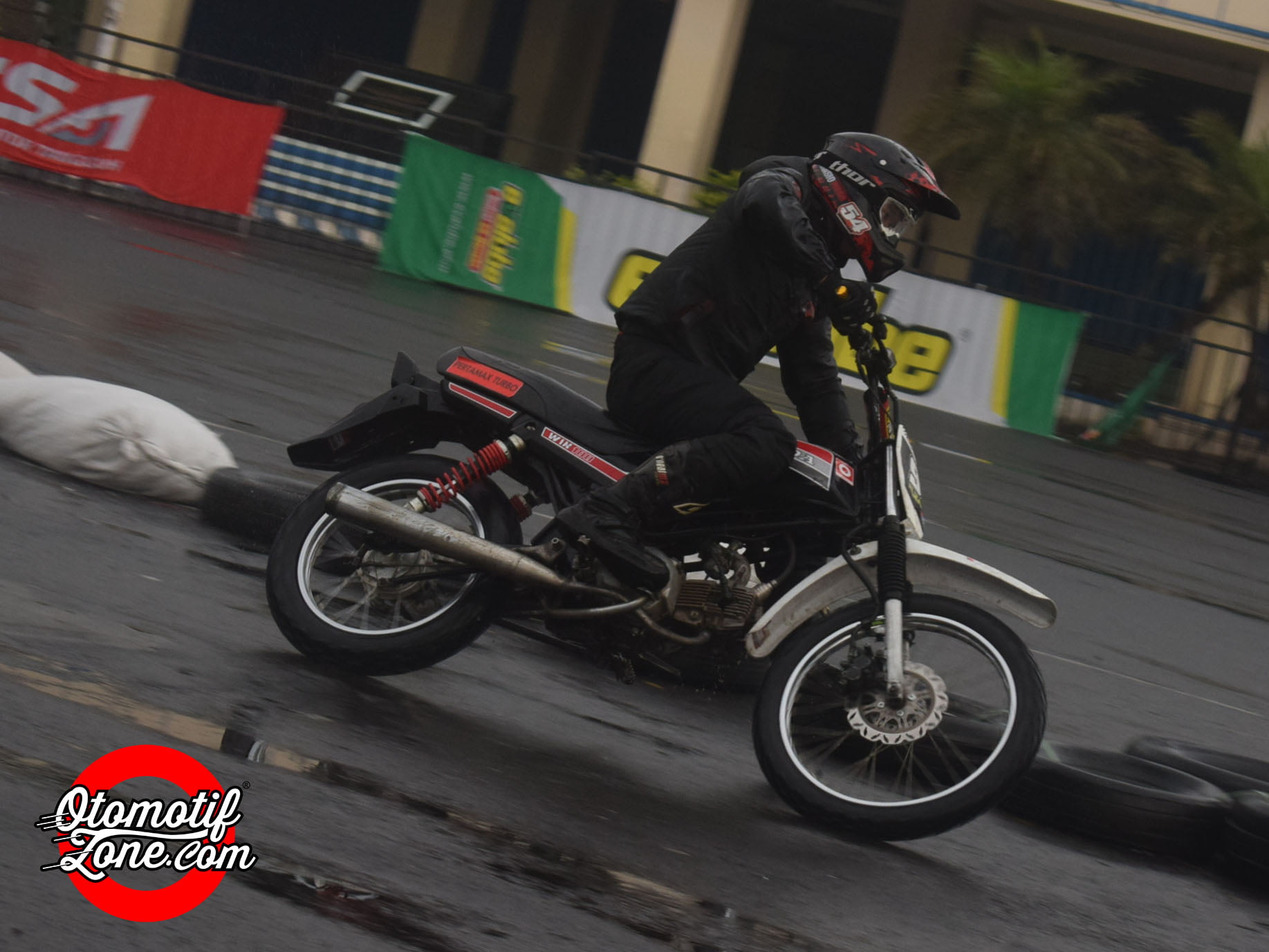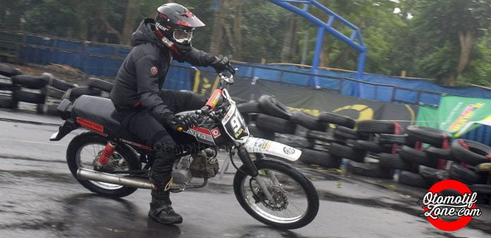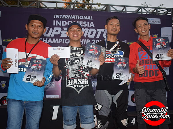 OtomotifZone – Kanjuruhan Malang. Nama Filza Afrizal Rezandy crosser sekaligus Otozoner tim Family Tech dari Komunitas WIN Rider Ngalam dinobatkan menjadi pemenang di kelas Super WIN Oto di Final Kejurnas Supermoto 2017 kemarin(8/10) di Kanjuruhan Malang. Filza panggilan akrab putra Hendri SAM ini sukses menoreh catatan tersingkat di antara 19 rider lain di kelas One Make Race Honda Win ini. Berbekal Honda Win besutan sang ayah tak banyak rubahan yang dilakukan demi lari terkencang. ” Semua standart, hanya perubahan di piston memakai Kawasaki Kaze yang tak jika dihitung kapasitas ruang bakar masih kurang dari 130 cc ” ujar Hendri Sam sang ayah.