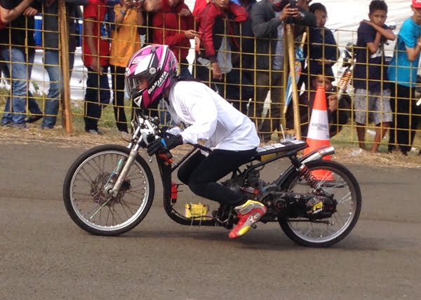Otomotifzone.com – Cicangkal Tangsel. Wiwi Mungil pebalap drag race yang banyak digandrungi laki-laki ini berhasil menjadi yang tercepat dikelas matic TU 155 khusus wanita digelaran Dragbike Bodisa.