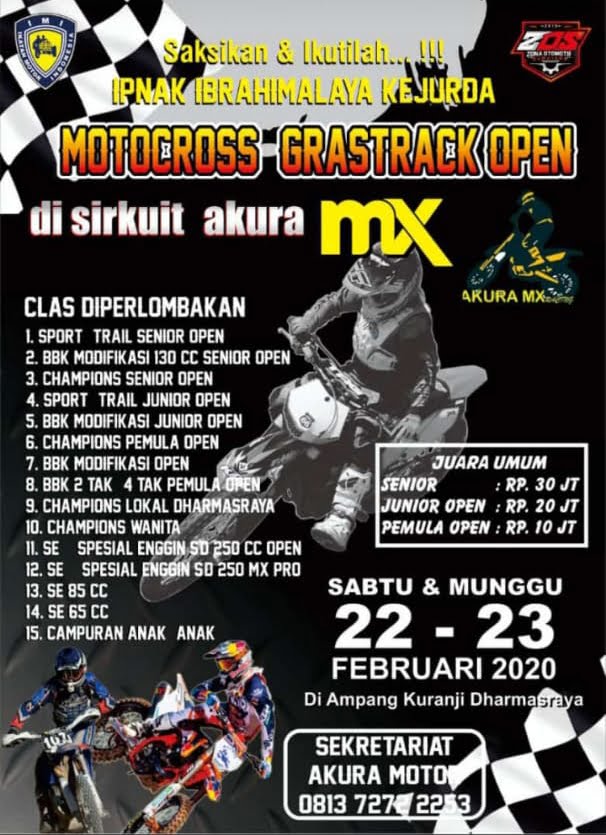 Pokoknya catat tanggal dan tempatnya, yaitu 22-23 Febuari 2020 di Sirkuit Akura Mx Drahmasraya. Bagi temen-temen Otozoner jangan sampai ketinggalan untuk mengikuti dan meramaikan event yang sangat istimewa ini. Dan untuk para rider serta team yang akan mengikuti event ini sudah bisa mendaftarkan pembalap kalian ke panitia.
