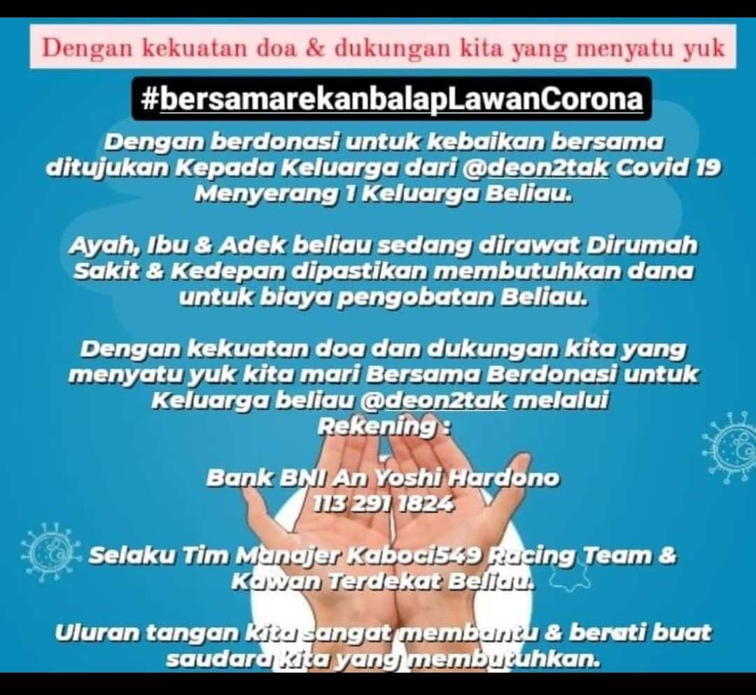 Malalui manajer teknik dari tim 549 KABOCI, Yoshi Hardono yang merupakan orang otomotif yang namanya sudah tidak asing lagi. Yoshi beserta kawan kawan lainnya melakukan galang dana dengan hastag #bersamarekanbalaplawancorona . Galang dana ini dilakukan untuk Deon pria yang juga sudah akrab didunia otomotif terutama balap Indonesia sejak lama.