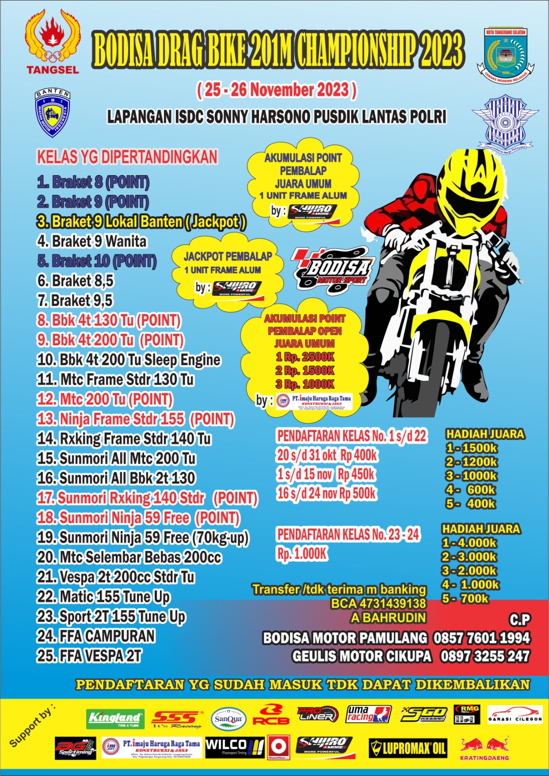 Drag Bike dan Drag Race adalah jenis balap motor yang menuntut kecepatan dan reaksi yang cepat, sehingga persaingan di acara ini selalu panas. Dengan partisipasi pebalap dan tim papan atas, kita dapat yakin bahwa acara ini akan menampilkan aksi balap yang menegangkan dan kompetisi yang sengit.
