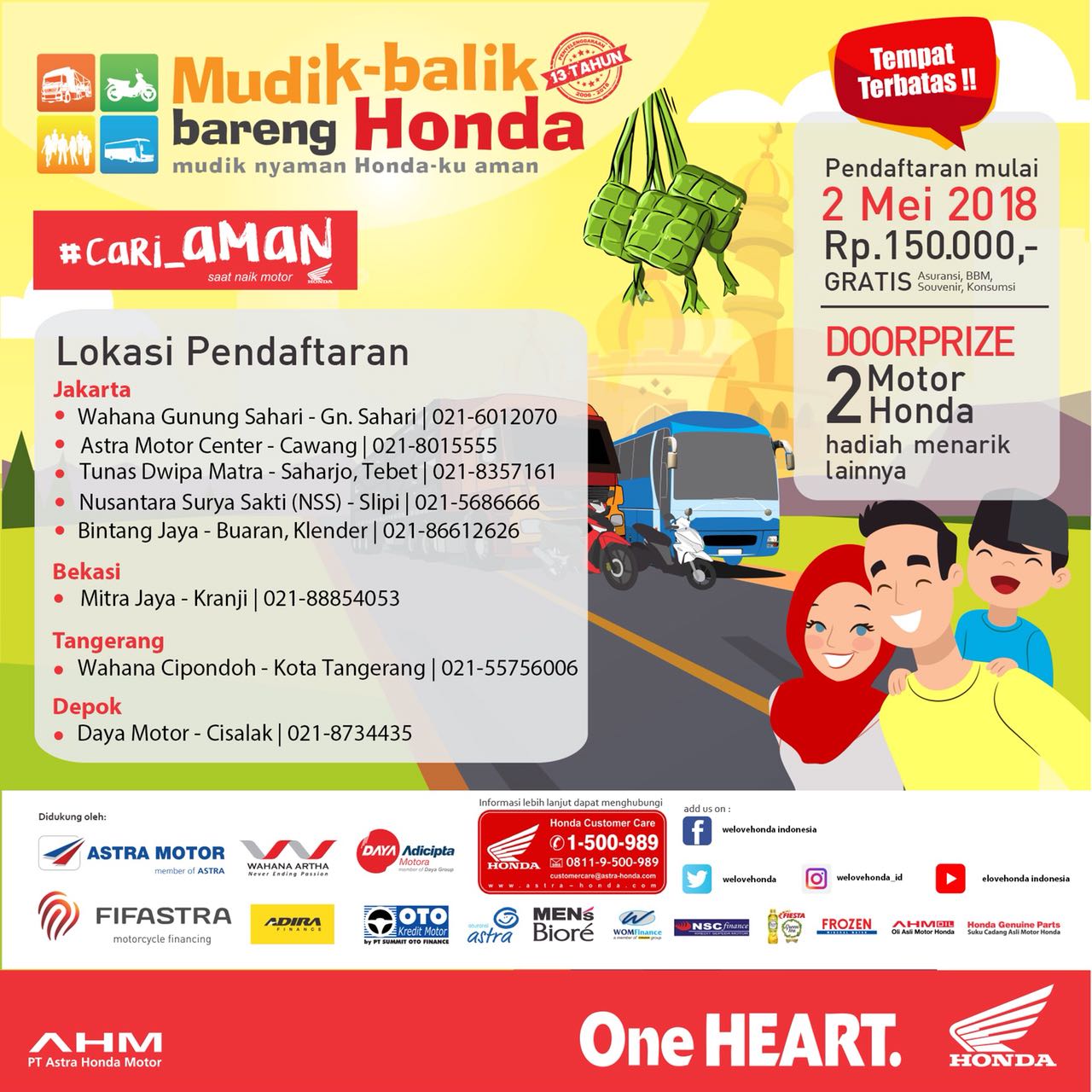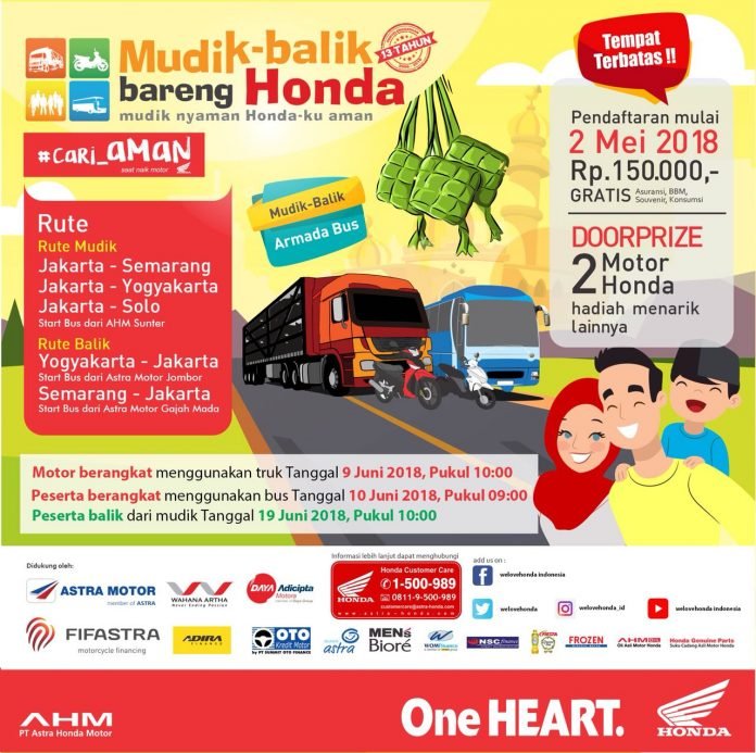 Otomotifzone.com – Jakarta. Honda akan adakan Mudik – Balik bareng pada tahun 2018. Masyarakat yang ingin mengikuti mudik bareng ini sudah bisa mendaftarkan dirinya di beberapa cabang yang sudah ditentukan. Pada tahun ini Honda adakan Mudik bareng dan menentukan 3 titik daerah. Dan pada arus balik mereka juga adakan balik bareng Honda.